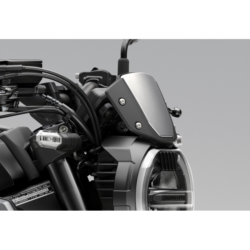 Saute-vent équipé d'un panneau en aluminium améliorant le design du CB650R. Le Kit de fixation de saute-vent est à commander séparément.
