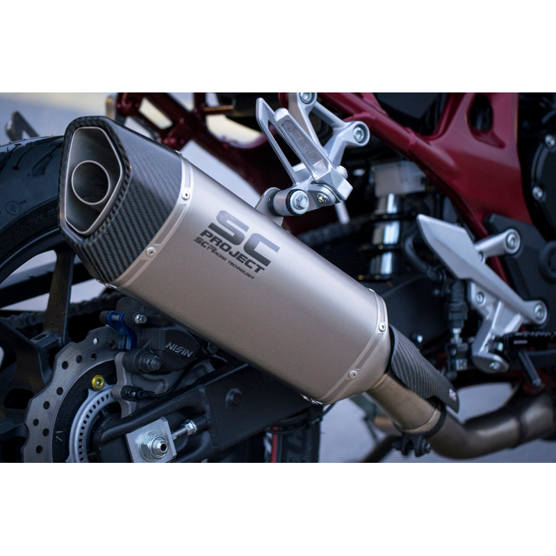 Silencieux d'echappement SC-Project en titane avec embout carbone. ∙ Homologation Euro 5 ∙ Poids : 2,45 kg (-1,4 kg que le silencieux d’origine) ∙Puissance : +1,4 cv à 9 700 t/min ∙Couple : +2,2 Nm à 5 000 tr/min ∙Protection de talon en carbone incluse Cette reférence est un accessoire local.