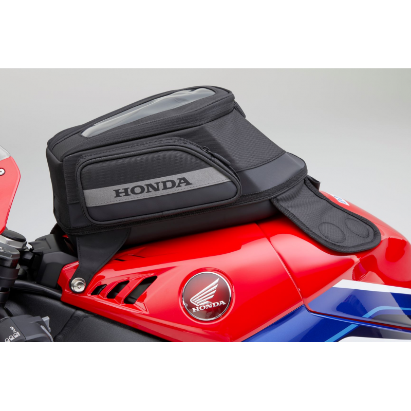 Grâce à sa fermeture Tenax à l'avant, la sacoche de réservoir peut être rapidement fixé ou retiré, et il reste fermement fixé une fois installé. Son design Honda d'origine épouse parfaitement la forme du réservoir pour offrir une capacité suffisante de 7 litres sans nuire à la maniabilité de la Fireblade. Une poche transparente pratique sur le dessus comporte une fente à l'avant pour acheminer un câble si nécessaire. De chaque côté, des poches zippées ornées du logo Honda permettent d'organiser le rangement de vos objets personnels. Facile à transporter grâce à sa poignée, la sacoche de réservoir peut être protégée de la pluie grâce à la housse incluse. • Matière: polyester • Capacité: 7L • Capacité de charge: 2 kg Si elles sont placées près des aimants du sac de réservoir, les cartes magnétiques peuvent devenir inutilisables