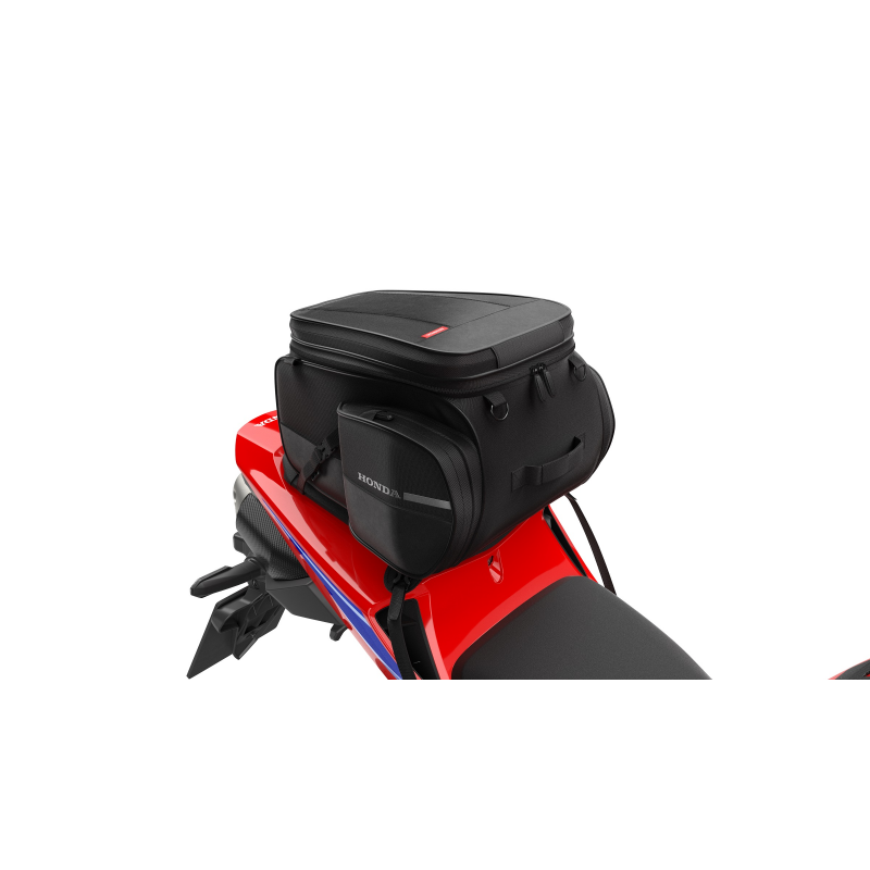 Sacoche arrière fonctionnelle spécifiquement adaptée à la forme effilée de la selle passager. Capacité de 15L pouvant être étendue à 22L. S'installe facilement et parfaitement stable. Housse de pluie incluse. Dimensions : 355 largeur X 365 longueur X 243 hauteur (mm). Le kit comprend: ・ 08L70-MKZ-J30 / FIXATION SACOCHE DE SELLE ・ 08L73-MKJ-D00 / SACOCHE DE SELLE